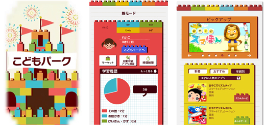 「こどもパーク」は、月額情報料790円 (税込) で、auスマートフォンから音楽、英語、お絵かき、パズルなど、多彩なジャンルの子ども向けアプリケーション50種以上が取り放題となるだけでなく、各アプリケーションの利用状況や学習履歴をまとめて確認することが出来るサービスです。保護者はお子さまの学習状況をチェックしながら、お子さまの知的能力の発達を促せます。さらに、保護者が指定したアプリケーションのみ利用可能とすることで誤操作等が防止出来る「こどもモード」などの機能により、保護者のスマートフォンからでもお子さまが安心してご利用いただけます。