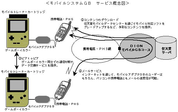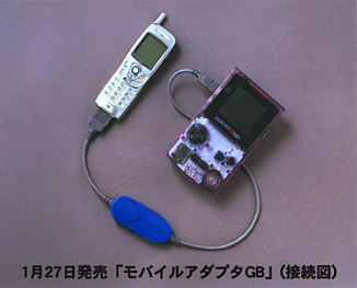 任天堂株式会社(社長:山内溥、本社:京都市南区)とKDDI(株式会社ディーディーアイ、社長: 、本社:東京)は、任天堂の携帯ゲーム機「ゲームボーイカラー」と携帯電話・PHSとを接続する「モバイルアダプタGB」(標準小売価格 5,800円)をKDDIグループ(auグループ、ツーカーグループ、DDIポケット)の全国約2,800の店舗で、1月27日から販売することで合意しましたのでお知らせします。「モバイルアダプタGB」は、携帯ゲーム機に携帯電話・PHSを接続し、通信による新しいゲーム等のサービスを提供する商品です。これまでにない、新しい仕組みを使ったサービスであり、そのユーザーの皆様も子供から大人まで多岐にわたることから、任天堂では店頭で商品および仕組みの十分な説明を行ったうえでの販売が重要と考え、一方KDDIグループは、同グループの携帯電話・PHSの普及に関連する種々のサービスを積極的に展開していることから、この新しい取組みについて、お互いに協力して推進していくこととしました。 任天堂は、「モバイルアダプタGB」の広告宣伝に、シアトル・マリナーズの佐々木主浩選手を登用し、「子供たちにも、新しいゲームの世界にチャレンジさせたい。」というキャッチコピーで、1月12日よりTV宣伝を大々的に投入するほか、店頭の幟やステッカーをKDDIグループの店舗に提供するとともに、ユーザーの皆様からのフリーコールでのお問い合せ受付を実施するなど、積極的な販売促進活動を展開していきます。 また、KDDIグループは、今回任天堂が新しく提供するゲームサービスのバックボーンネットワークにKDDIのインターネット接続サービス「DION」を利用し、専用のサービスメニューである「DIONモバイルGBコース」を提供するなど、この新しい仕組みを積極的に支援していきます。