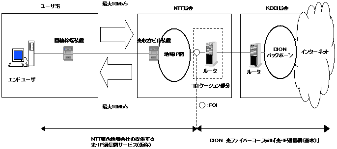 NTT東西地域会社の提供する「光・IP通信網サービス(仮称)」をアクセス回線として利用し、同サービスの"基本メニュー"に対応した最大速度10Mbpsのインターネット接続サービスです(接続概念図参照。)