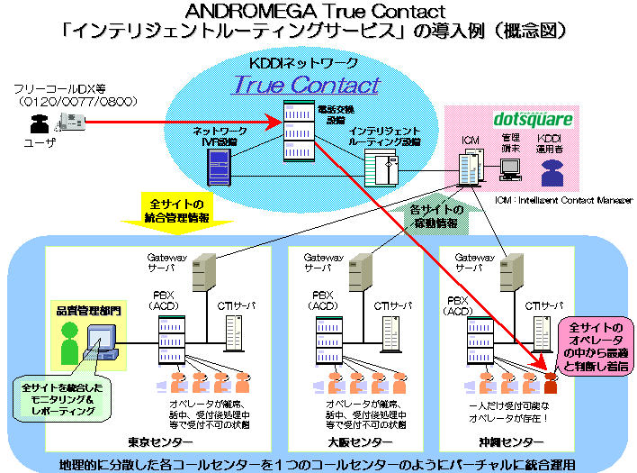 | ANDROMEGA True Contact 「インテリジェントルーティングサービス」は、複数のサイトでコールセンターを運営するお客様向けのサービスで、KDDIのネットワークとお客様のコールセンターとの連携により、フリーコールDX(注)等から発信されたコールを対象に高度なルーティング機能等を提供します。