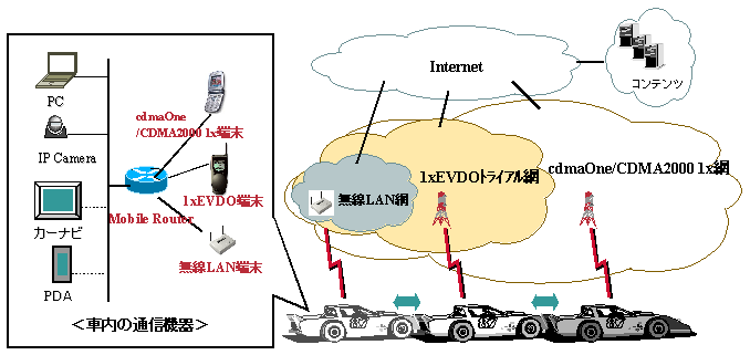 その環境下における自動車等でのデータ通信サービスを想定し、自動車内には携帯電話端末(CDMA2000 1x/1xEV-DO、cdmaOne)、無線LAN端末をシスコシステムズ製の車載用モバイルルータで接続し、アプリケーション用PCやIPカメラを車内LANとして搭載しました。以上の設定条件にモバイルIP技術を応用して、既存のネットワークおよび通信端末に影響を与えることなく、複数の無線アクセスメディア間にまたがるシームレスな通信サービスの検証をしました。