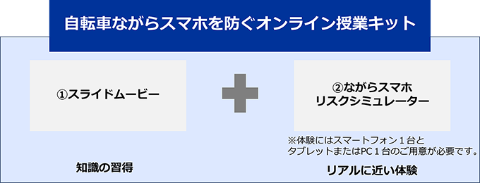 「スライドムービー」と本プロジェクトで制作した「ながらスマホリスクシミュレーター」をセットにした「自転車ながらスマホの危険性を学ぶための授業 (50分)」です。先生は本授業キットを活用することにより、通常の授業を実施する要領で簡単に授業を実施可能です。生徒はリアルに近い体験を通じて「自転車ながらスマホ」の危険性や問題点を自発的に考えることが可能です。また、本教材は第3弾の「自転車ながらスマホを防ぐVR授業キット」とは異なり、オンライン授業でも利用可能な教材となっています。