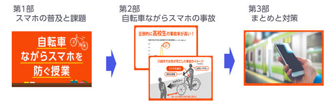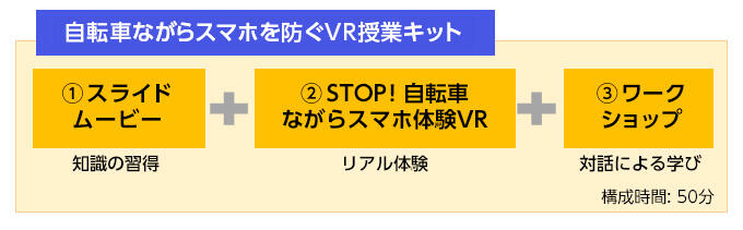 「スライドムービー」と本プロジェクトで制作した「STOP! 自転車ながらスマホ体験VR」、「ワークショップ」をセットにした「自転車ながらスマホの危険性を学ぶための授業 (50分)」です。
