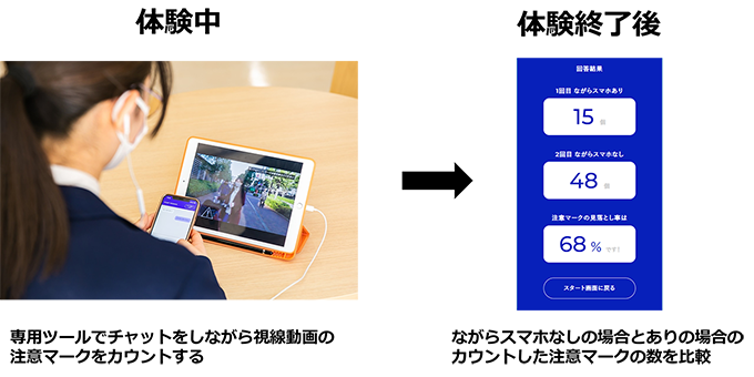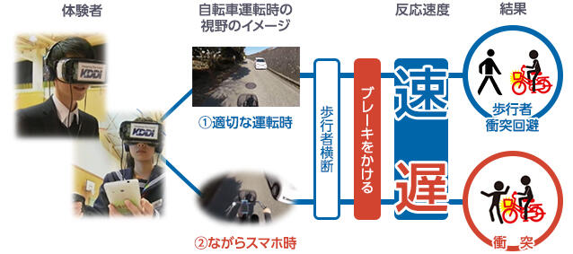 自転車ながらスマホの危険性を、「適切な運転時」、「ながらスマホ時」における視野や反応速度の違いをリアルに体験します。