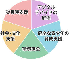 「デジタル・ディバイド(※)の解消」「健全な青少年の育成支援」「環境保全」「社会・文化支援」「災害時支援」の5分野を社会貢献活動の中期的テーマと定め、ネットワーク、商品・サービスなど持てる資源を最大限に活用し、KDDIらしいICTを活用した社会貢献活動を実践します。またKDDI財団において、海外新興国での活動も積極的に行っています。