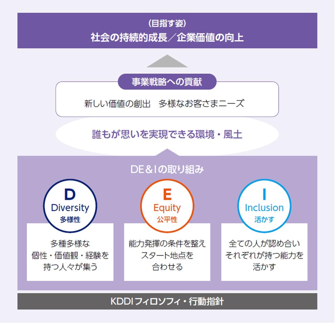 KDDIでは、2023年にD&Iに公平性(エクイティ)を加えDE&Iにフェーズアップし、多様な社員の活躍推進を加速させています。