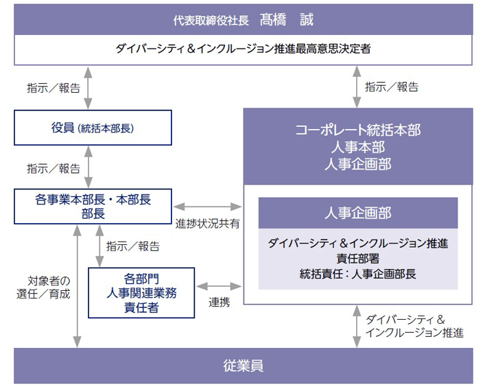 2023年度より、経営層が女性活躍に関して定期的に議論する場として「女性人財開発会議」を設置し、経営層が定期的に女性活躍推進に対する意識を合わせ、全社的な取り組みを一層強化・加速することに努めています。