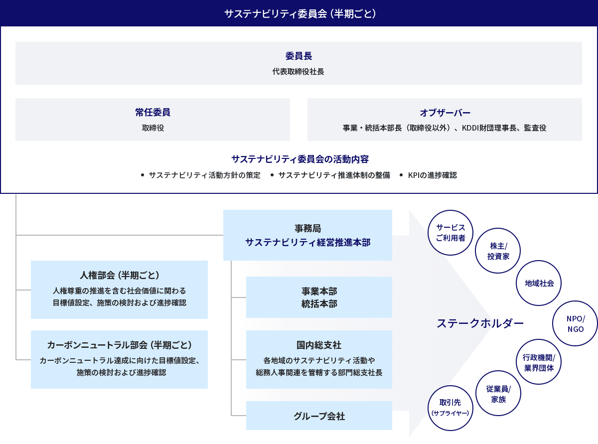 KDDI渉外部門が総務省や経済産業省などの政策決定者からの働きかけについて常時情報を収集しており、対応が求められている案件は社内の関連部署へ情報が展開されます。展開された気候変動関連で重要な課題は、関連部署で検討を行い、その検討結果をカーボンニュートラル部会やサステナビリティ委員会に報告し、サステナビリティ委員会の委員長である社長が最終責任を負うとともに、KDDI渉外部門を通して政策決定者へ直接的に対応します。また、業界団体での活動がパリ協定(平均気温上昇を産業革命以前より2℃低く保つとともに、1.5℃未満に抑える)に沿うものであるか、当社の気候変動に関する方針、取り組みの方向性と合致しているかの評価・管理を含め、委員長の責任の下、サステナビリティ経営推進本部が監視しています。