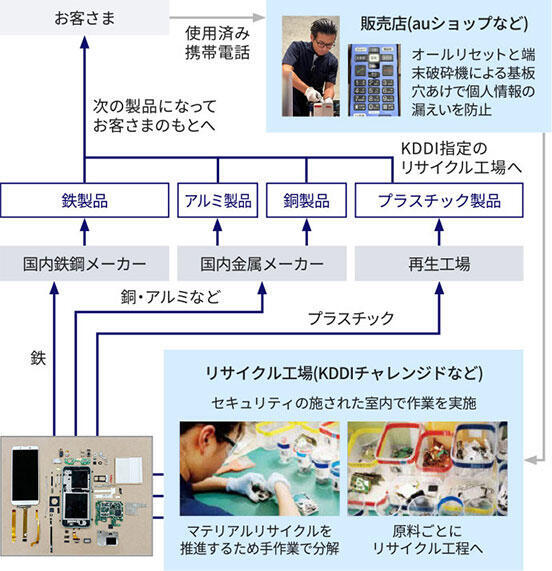 au Style/auショップでお客さまから回収した使用済み携帯電話は、セキュリティの施された室内で、手作業によって、基板、液晶、カメラ、プラスチック、ネジ、アンテナ、モーター、スピーカーなどに分解します。基板から金、銀、銅、パラジウムなどが採取され、ネジやアンテナは鉄製品に、プラスチックは可能な限りプラスチック製品にそれぞれリサイクルされます。携帯電話を機械で分解した場合、焼却処理によりプラスチック類は再資源化されず燃焼します。