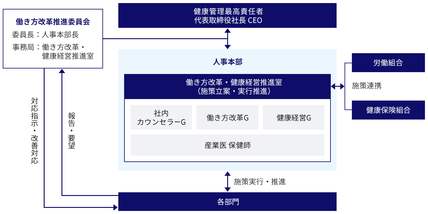 「安全衛生管理規程」および「労働協約」を遵守し、各事業所には総括安全衛生管理者、安全管理者、衛生管理者、安全衛生推進者、衛生推進者、産業医、メンタルヘルス推進担当者、安全衛生委員を選任し、安全衛生管理体制を整えています。