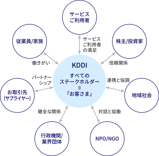 KDDIの事業は、お客さま、株主さま、お取引先さま、従業員とその家族、地域社会などのステークホルダーの皆さまと関わりを持っています。