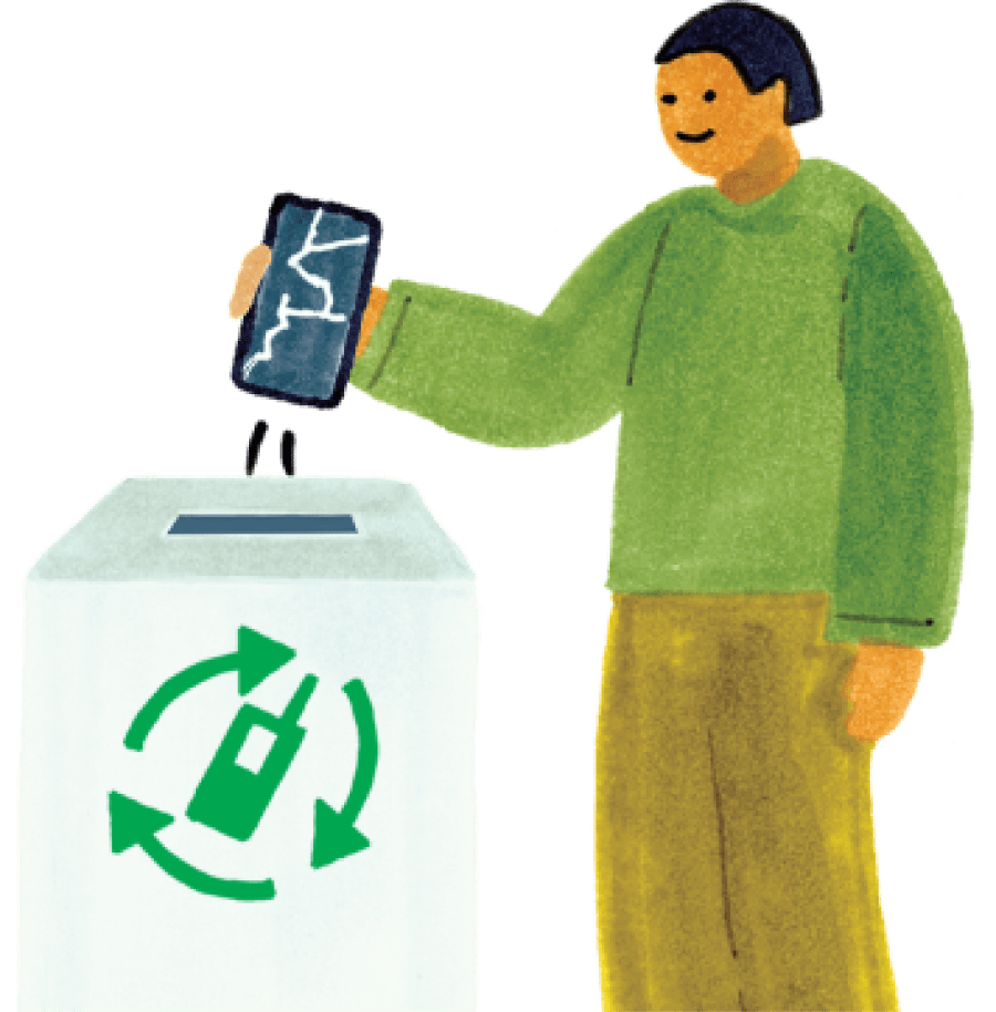 KDDIの携帯電話のリサイクルへの取り組みは、2005年にスタートしました。当時、新たな機種が次々と登場するなか、使用済みの携帯電話の回収とリサイクルが大きな課題となっていました。そこでKDDIは、au Style/auショップに、回収用のリサイクルボックスと、個人情報を取り出せないように端末に穴あけするための端末破砕機を設置。回収した携帯電話は手分解によって99.8%が新たな素材に生まれ変わっています。