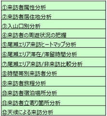 マーケティングデータとして、尾瀬国立公園への来訪者の属性や行動を可視化するにあたり、檜枝岐村様と意見交換をさせて頂き、全12項目の動態分析を行うことと致しました。