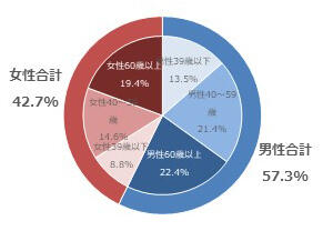 - 来訪者の性別は男性が57%とやや多く、年代は40代以上が全体の77%を占める。
