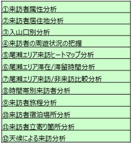 マーケティングデータとして、尾瀬国立公園への来訪者の属性や行動を可視化するにあたり、片品村様、尾瀬を熟知されている東京パワーテクノロジー株式会社様と意見交換をさせて頂き、全12項目の動態分析を行うことと致しました。
