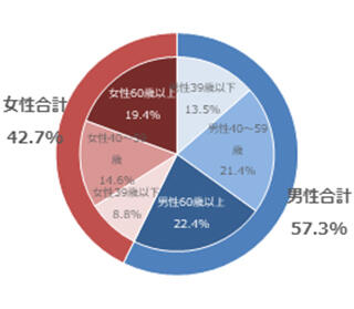 - 来訪者の性別は男性が57%とやや多く、年代は40代以上が全体の77%を占める。