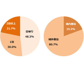 - 来訪者の旅程は、宿泊が5割を占めるものの、片品村域内の宿泊は2割に留まる。