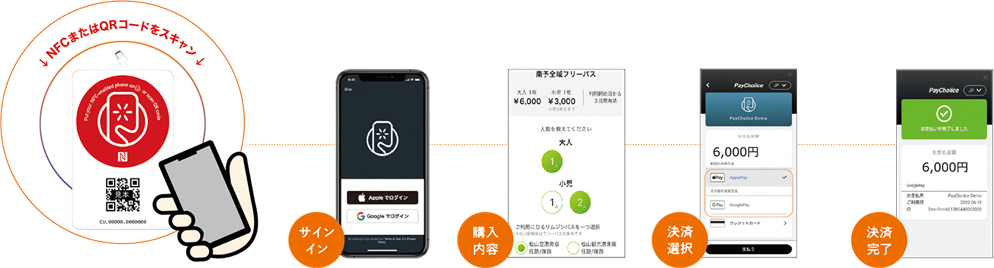 自分のスマートフォンを空港や駅などに設置されたNFCタグにかざすかQRコードを読み込むとデジタルフリーパスの購入画面が表示されます。Google ID、Apple IDと連携し、スマートフォンに登録済の決済手段を呼び出すことで、会員登録、決済ができます。