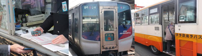 デジタルフリーパスを見せるだけで、南予地域のJR四国の特急列車、伊予鉄グループの路線バス、宇和島自動車の路線バスが乗り放題。