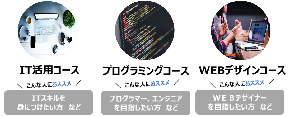 本プログラムでは、受講者のニーズに応えられるようにレベルの異なる3コースが設けられた。デジタルの基本を学ぶ「IT活用コース」、サイト制作など実践的な応用を学ぶ「WEBデザインコース」、そしてより専門的な「プログラミングコース」。