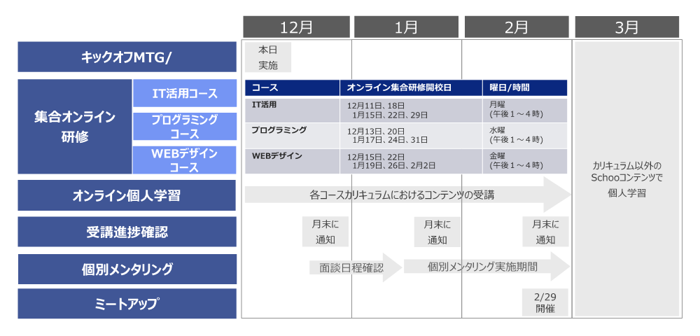 2023年12月、プログラムがスタート。受講者は3コース合わせて約30名。30代~50代が中心でとりわけ40代が多かった。受講動機として、今後の求職活動に向けて高度なスキルを身に付けたいという声が多く、子育てが落ち着き何かスキルを身に付けてチャレンジをしたいという方からの関心が集まったことがうかがわれる。12月6日に実施されたキックオフミーティングでは、受講者がリアルで集まり、対面でプログラムの目的や詳細についての説明が実施された。