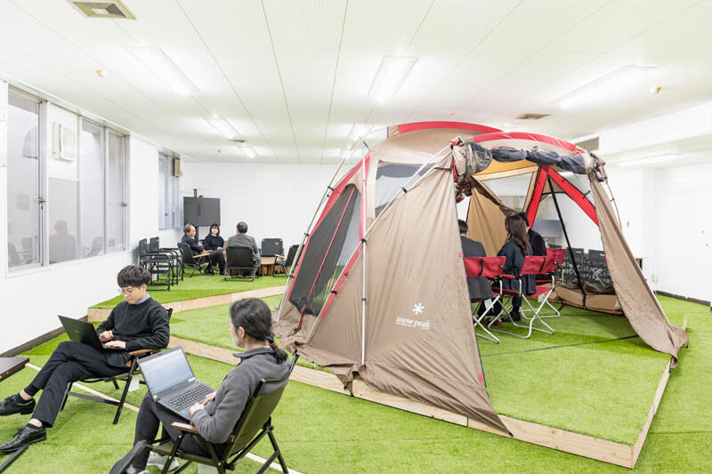インタビュー場所は、完成後間もない市役所地下の食堂跡スペース「ちかしょく」。三条市の若手職員有志がリニューアルを進め、「アウトドアのまち三条」にちなんで屋外をイメージした人工芝やテント、椅子やカウンターを設置。勤務フロアとは異なる環境で、思い思いに打合せや休憩ができるスペースになっている。