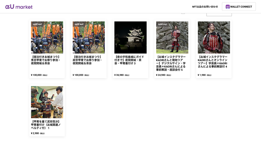 今回の実証実験では、宇和島城にまつわる5つの体験を用意し、KDDIのNFTマーケットプレイス「αU market」で発売しました。体験内容は「夜間開城ガイド付きツアー」「お城インスタグラマーの現地ツアー参加権」「天赦園でのお茶会」「甲冑着付け体験」「特別甲冑を着用したお城まつりへの参加権」などです。