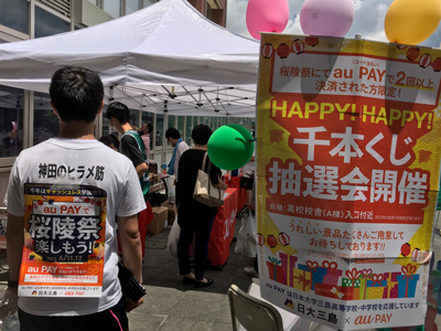 加盟店申込や校内におけるサービスロゴ利用許可など、学校が普段なさらない業務も日大三島様のご協力で無事乗り切り、より盛り上げるために、生徒会とアイデアをだしあうかたちで「au PAY利用するとくじ引きがひける!」という企画も実現し、心配した天気も2日間とも好天にも恵まれ、無事盛会のうちに終了しました。