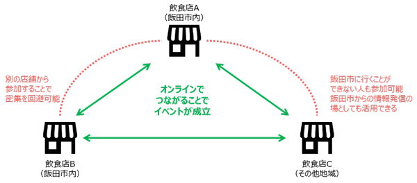 ウィズコロナ時代における地域活性化を目的に、遠隔の飲食店同士をオンラインでつなぐ取り組みを実施します。第1弾として11月1日から開催する「2020飯田丘フェス月間」において、開催日ごとに異なったコンセプトで、飯田市ならではの食材やコンテンツを提供します。