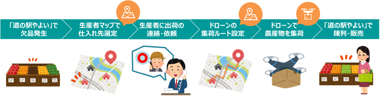 なお、生産者マップを活用してドローンの集荷ルートを設定し、即売するサービス実証は日本初 (