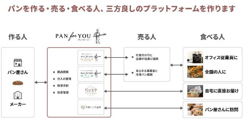 パンフォーユーは「地域パン屋のプラットフォームとして、地域経済に貢献し、新しいパン経済圏をつくる。」を事業ミッションに掲げ、地域のベーカリーが抱える運営や販路拡大などの課題に対し、独自の冷凍とITの技術による解決を行っており、パンフォーユーが有する冷凍技術を活用し、地域のベーカリーのパンを全国へ届ける、様々なサービスを展開しています。
