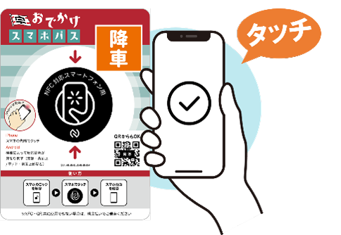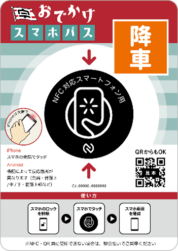 - バスの乗降時に、車内設置のNFCタグにスマートフォンをかざすと、バスの位置情報とスマートフォンの情報がクラウドシステム上で連携し、乗車バス停、降車バス停を推定します。