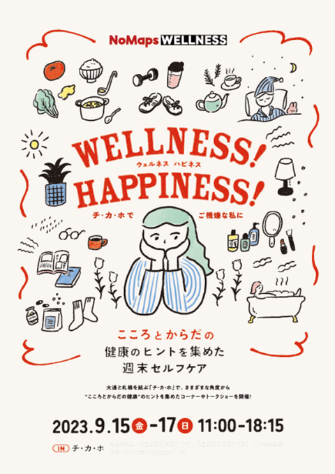 今年の「NoMaps2023」は多くの市民が行き交う札幌駅前通地下歩行空間(チ・カ・ホ)を、より市民生活に身近な“健康”をテーマにした会場と位置づけ、「NoMaps」初となる「NoMapsWELLNESS」を開催します。さまざまな問題を抱える現代人がイキイキとした未来へ向かうためのアイデアやヒントの発信を行います。