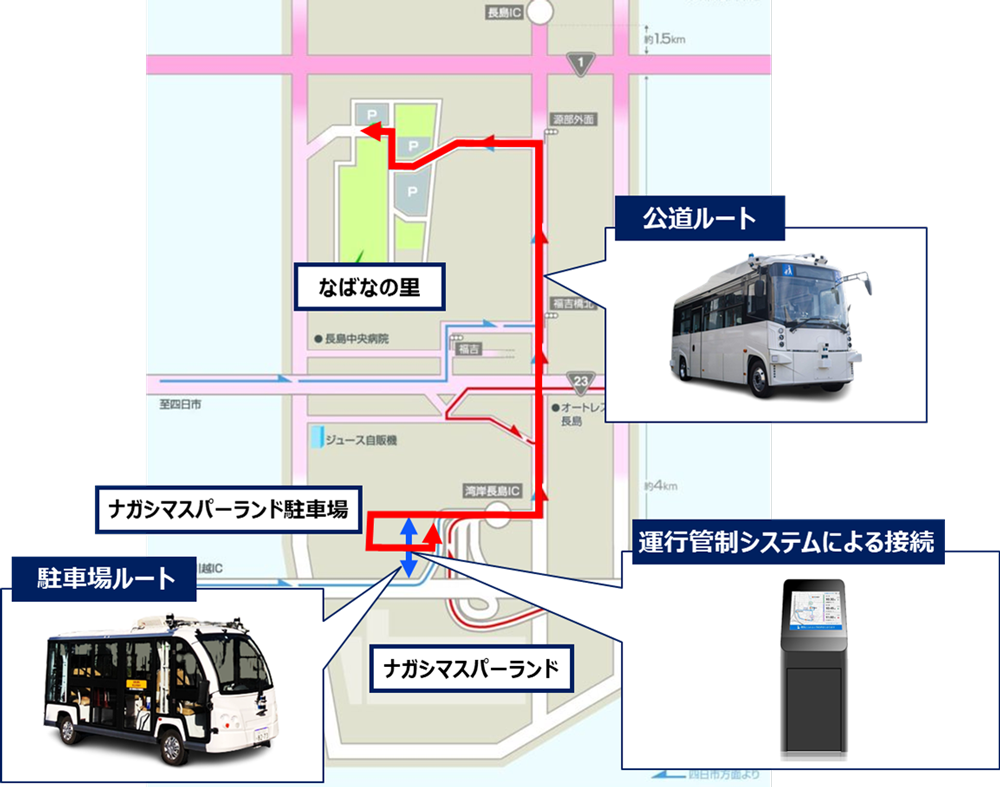 三重県桑名市(市長:伊藤 徳宇)、三重交通株式会社(本社:三重県津市、取締役社長:田端 英明)、長島観光開発株式会社(本社:三重県桑名市、代表取締役社長:舟橋 純)、アイサンテクノロジー株式会社(本社:愛知県名古屋市、代表取締役社長:加藤 淳)、A-Drive株式会社(本社:神奈川県横浜市、代表取締役社長:岡部 定勝)、株式会社ティアフォー(本社:愛知県名古屋市、代表取締役社長:武田 一哉)、三菱電機株式会社(本社:東京都千代田区、執行役社長:漆間 啓)、損害保険ジャパン株式会社(本社:東京都新宿区、代表取締役社長:白川 儀一)、KDDI株式会社(本社:東京都千代田区、代表取締役社長 CEO:髙橋 誠)は、国土交通省の地域公共交通確保維持改善事業費補助金(自動運転実証調査事業)に事業提案したところ採択されましたので、同事業の趣旨に則り、将来的な自動運転レベル4を活用した移動サービスの実現に向けた実証実験を実施します。