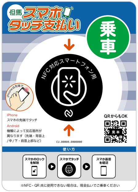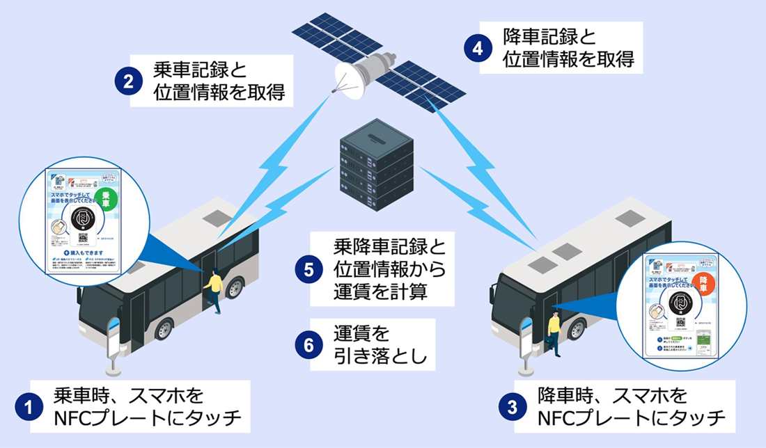 - バスの乗降時に、車内設置のNFCタグにスマートフォンをかざすと、バスの位置情報とスマートフォンの情報がクラウドシステム上で連携し、乗車バス停、降車バス停を推定します。