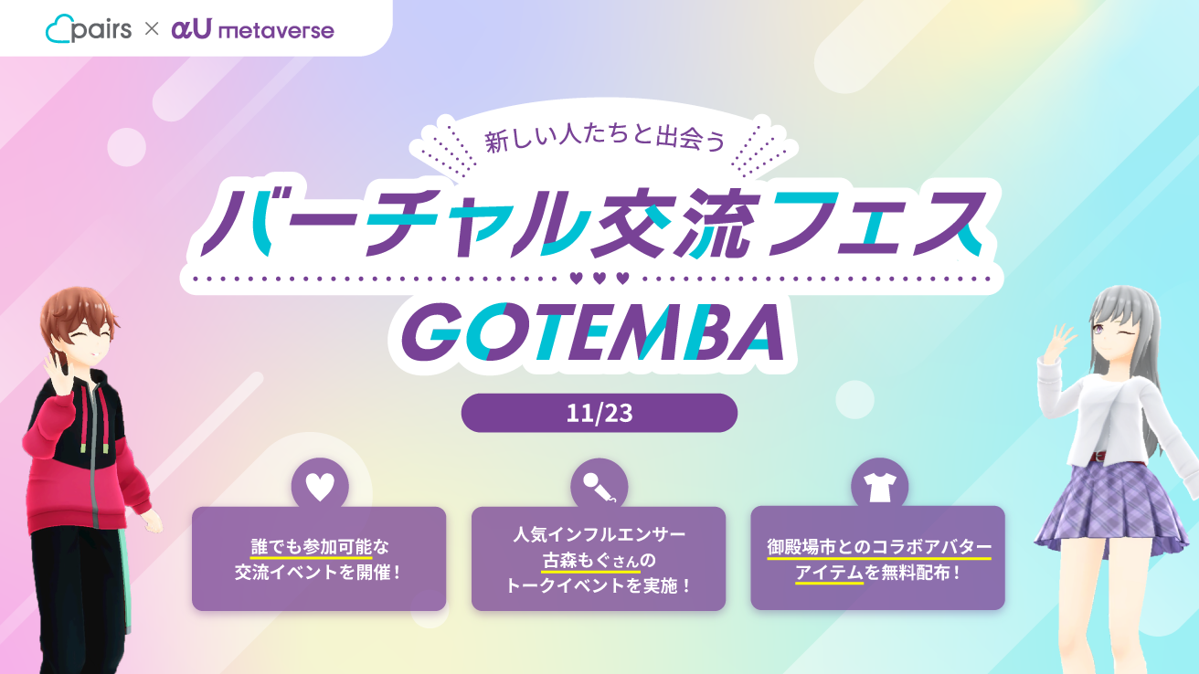 本イベントでは恋活・婚活マッチングアプリ「Pairs(ペアーズ)」の協力のもと、御殿場市に縁のある方や御殿場市に興味のある全国の参加者同士をマッチングする、メタバース上での交流イベントを実施します。また、人気インフルエンサーの古森もぐさんによる御殿場市をテーマにしたトークイベント、御殿場市とのコラボアバターアイテム無料配布なども実施します。