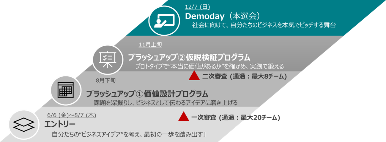 本プログラムは、8月から12月にかけて、ワークショップやメンタリングを通じてビジネスアイデアを段階的にブラッシュアップしていく実践型の育成プログラムです。