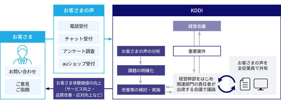 KDDIは、お客さまからいただいた貴重なご意見に対して、真摯に耳を傾け、迅速に行動し、常にサービスや品質を磨き上げる活動に取り組んでいます。