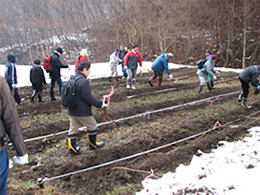 今回の活動は、昨年10月にテープで印付けしたイタヤカエデの幼木150本を林内から堀り出し、日当たりの良い苗畑に移植しました。