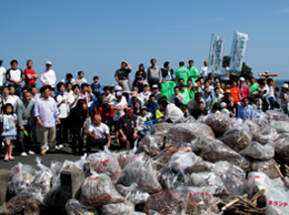 今回の活動は、当社が参加する「Think the Earth」プロジェクトへの協賛サイト「live earth」で、アカウミガメ保護活動の一環として行われ、さまざまな企業や団体、地域住民の方々総勢約300名とともに、砂浜のゴミをひとつひとつ拾い集めました。