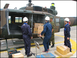 霞目駐屯地 (仙台市) において、災害時においても迅速な通信の復旧を図れるよう、東北方面航空隊保有の多用途ヘリコプターUH-1Jを使用し、搭乗時の安全教育や人員・器資材の空輸を円滑に行うための積載卸下 (しゃか) 訓練、実飛行訓練を受けました。