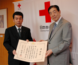 厚生労働大臣に代わり、日本赤十字社社長・近衛忠輝氏 (右) より、CSR・環境推進室 田中室長 (左) に感謝状を授与。