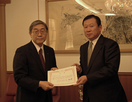 中華人民共和国大使館の曲公使 (右) から「感謝状」を受領する中澤総務・人事本部長 = 中華人民共和国駐日本国大使館 (東京都港区)。