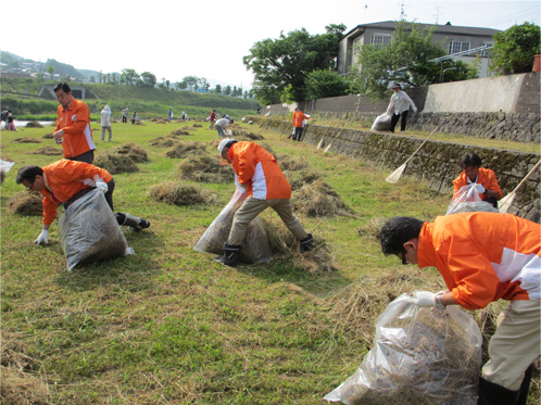 住民の方と一緒に河川敷の草を刈り集め、搬出。