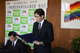 確認書を取交した (左) 行方市 伊藤市長と (右) KDDI土橋総務部長
