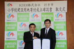 KDDIは、茨城県行方市所在の北浦用地 (一部) を、東日本大震災で被災した小学校再建のため、その建設用地として行方市に対し寄付採納を実施し、2012年3月19日には、寄附成立確認書の取り交わし式が行われました。