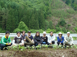 当日は、廃屋となった古民家周辺の荒れた土地を開墾し畑地にする作業や、前回 (5月) 植えた野菜の種の苗木を植え替える作業を行いました。また、作業後は、古民家を有効活用していくための取組方法や課題点などについてのワークショップを行いました。