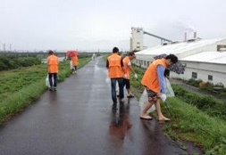当日は小雨の降る中、KDDIコンシューマ山陰支店の社員9名が多くの住民や団体の皆さんと一緒に傘を片手に河川のごみ拾いに励みました。