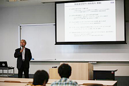 「モバイル通信サービスの多様化と今後の展望」について講義を行うKDDI研究所会長安田豊