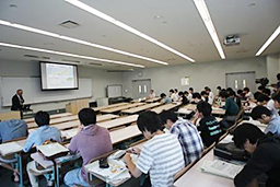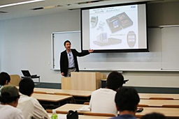 当日は、KDDI研究所会長の安田豊による「モバイル通信サービスの多様化と今後の展望 (スマホからその先へ)」、またKDDI 技術戦略部長の中村元による「スマートフォンの次に来るモノ」の講義が行われました。講義では、将来のARビジネス概略やウエアラブル端末、Google Glass APIなどが紹介され、参加した学生らからは「スケールが大きく、とても興味深い内容だった」との感想が寄せられました。